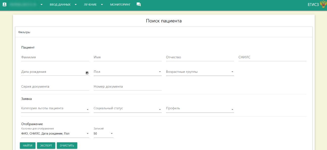 Для поиска заявок необходимо перейти в раздел «Лечение/ Поиск заявки».