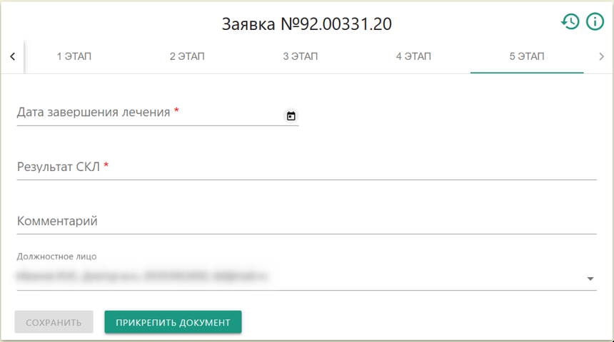 На 5 этапе сотрудник СКО заполняет дату завершения лечения, результат СКЛ, корректирует должностное лицо (при необходимости). При сохранении данного этапа заявка меняет статус на значение «Пролечена».