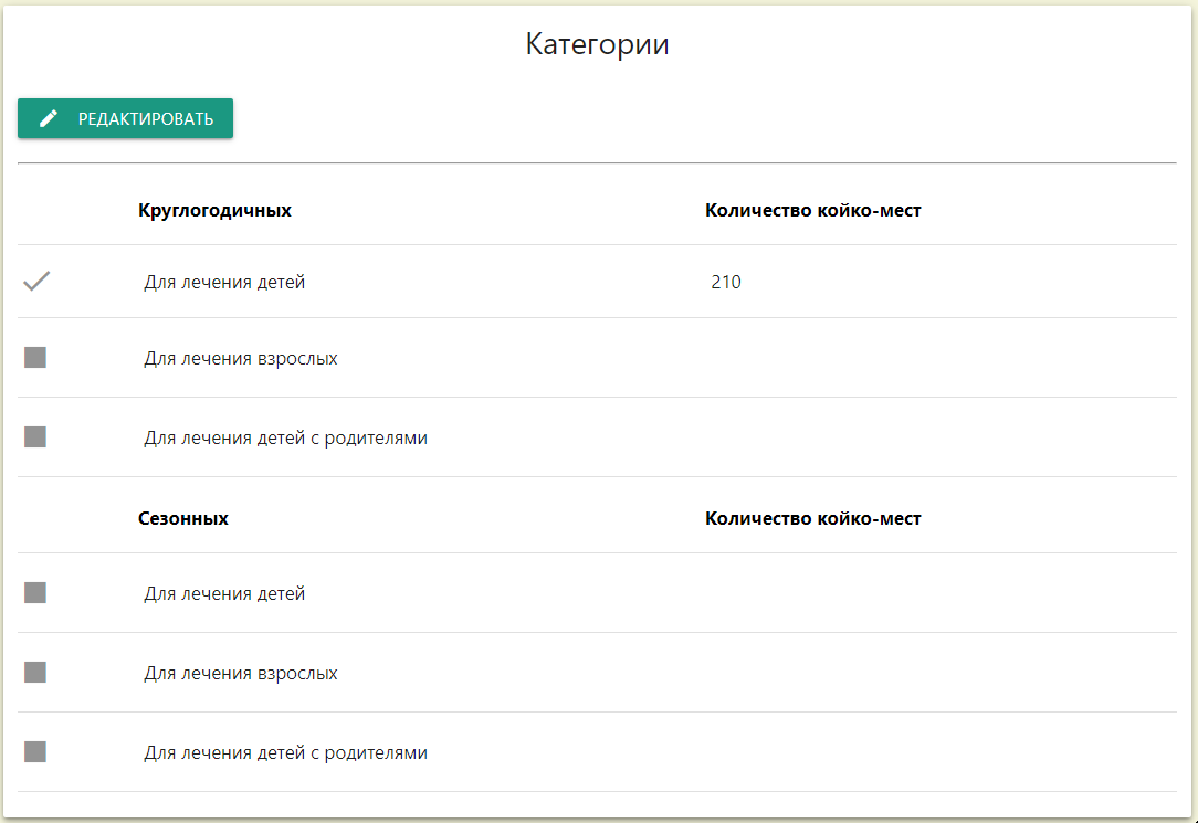Данный подраздел предназначен для ввода и отображения данных о количестве койко-мест для лечения детей, взрослых и детей с родителями в разрезе круглогодичного и сезонного пребывания.
