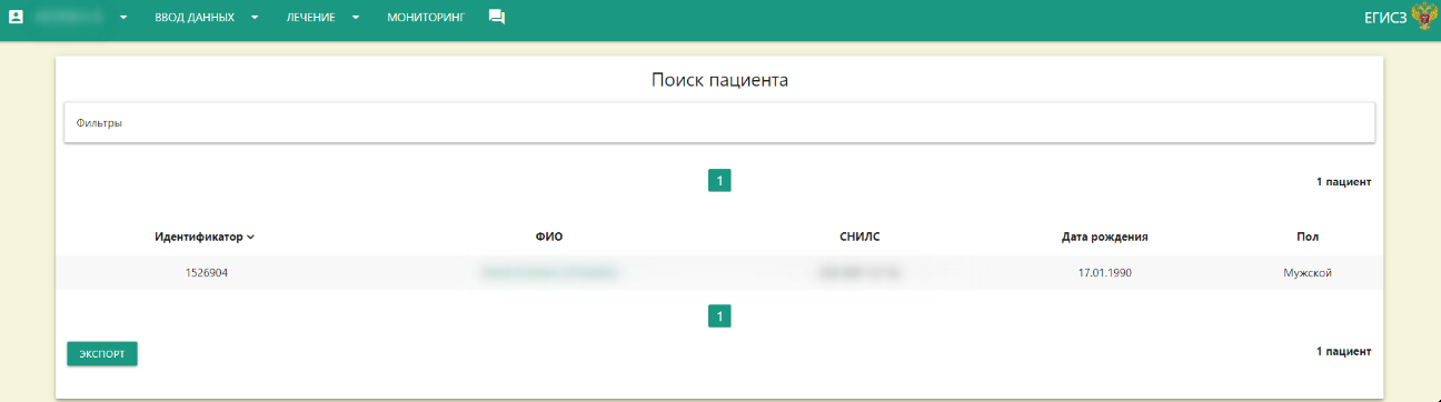 Кнопка «Экспорт» предназначена для выгрузки результатов поиска в виде выбора формата: xlsx или xls. В случае большой выборки будут экспортированы только первые 5000 пациентов.