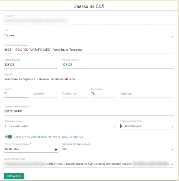 Для сопровождающего необходимо создать карту пациента и заявку на СКЛ (аналогично заявке на пациента), выбрав на 1 этапе в поле «Тип» значение «законный представитель» или «сопровождающее лицо».