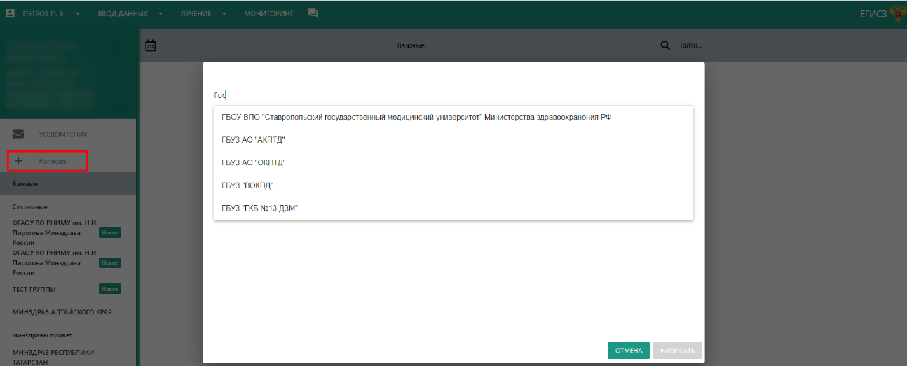 Чтобы создать новое уведомление, необходимо нажать на кнопку «Написать», в поле «Кому» ввести наименование организации, в которую будет направлено уведомление.