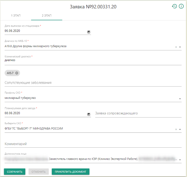 Сотрудник МО или ОУЗ заполняет поля 2 этапа заявки на санаторно-курортное лечение, в случае необходимости прикрепляет документ (по кнопке «Прикрепить документ»), далее нажимает на кнопку «Сохранить».