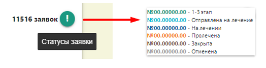В правом верхнем углу страницы отображается количество найденных заявок и присутствует легенда по статусу заявки (каждому статусу присвоен свой цвет). В таблице с результатами поиска данные в столбце «Номер заявки» окрашены цветом в соответствии с легендой номера заявок.