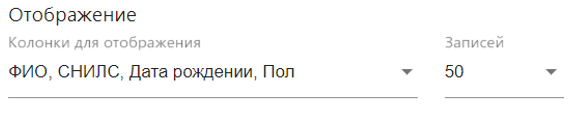 Результаты поиска выводятся в табличном представлении, где строки – найденные карты пациентов, столбцы – данные о пациенте. Настройки «Колонки для отображения» и «Количество записей на странице» позволяют управлять внешним видом страницы и выводимым на ней содержимым. Список колонок для отображения настраивается самостоятельно в Фильтрах.
