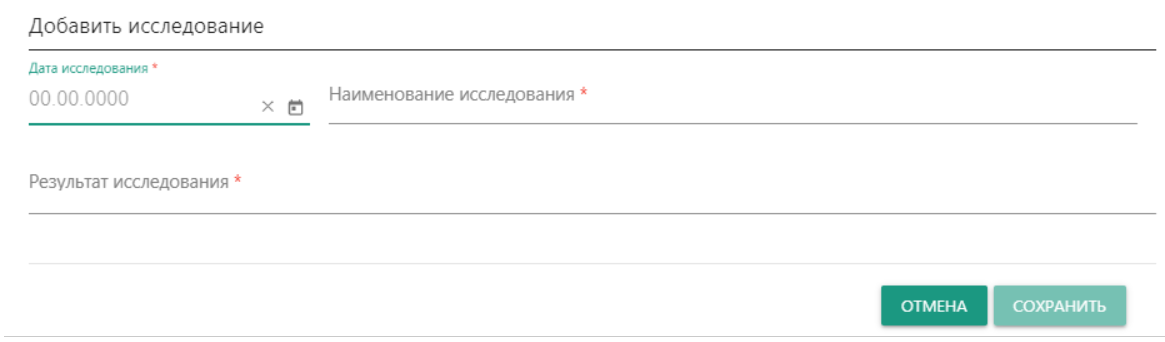На вкладке «Исследования» добавляются даты и результаты исследований. Для добавления дополнительного исследования можно воспользоваться формой «Добавить Исследование». Требуется ввести наименование, дату и результат исследования и нажать на кнопку «Сохранить», после чего добавится строка с дополнительным исследованием. Эту строку можно удалить, нажав на значок