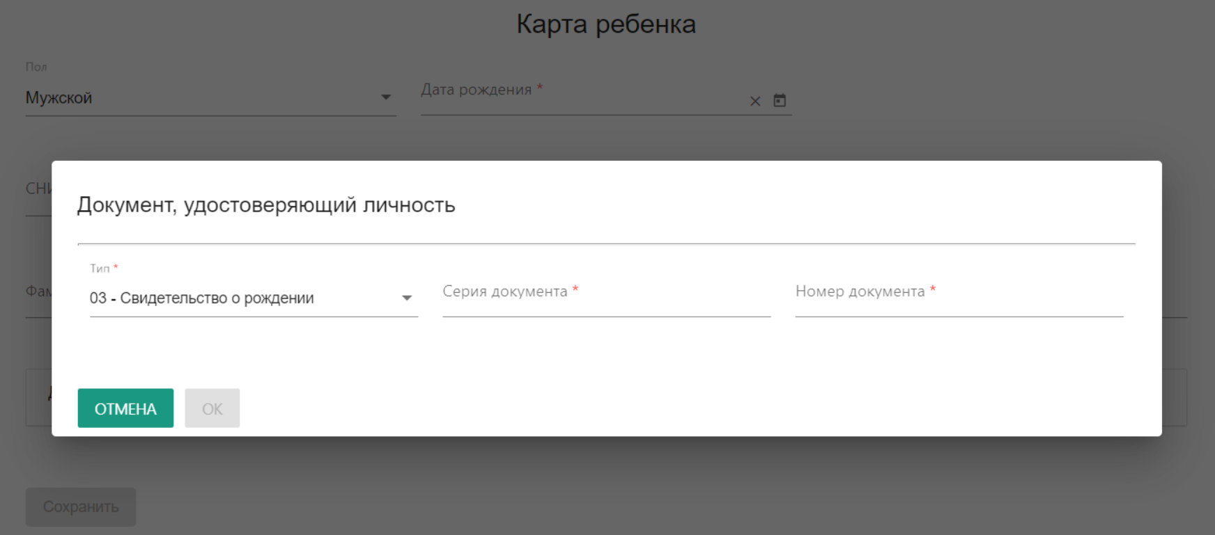 - «Серия» и «Номер» документа, удостоверяющего личность ребенка.