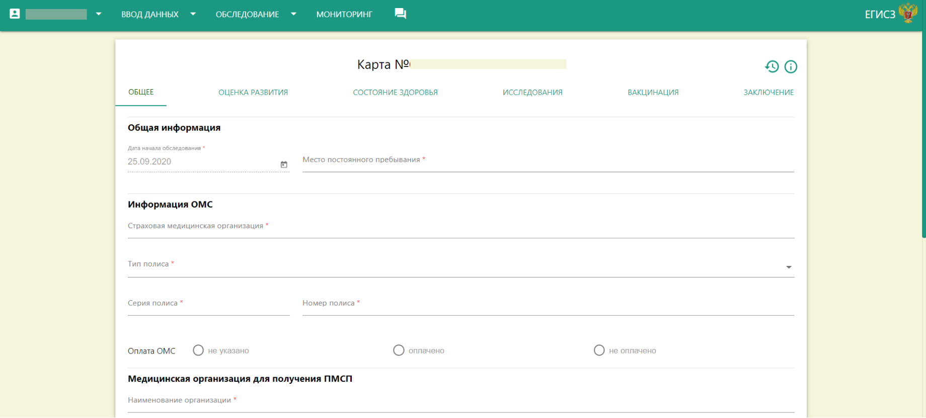 - Общие сведения об исследовании («Тип карты», «Статус», «МО, проводящая осмотр»);