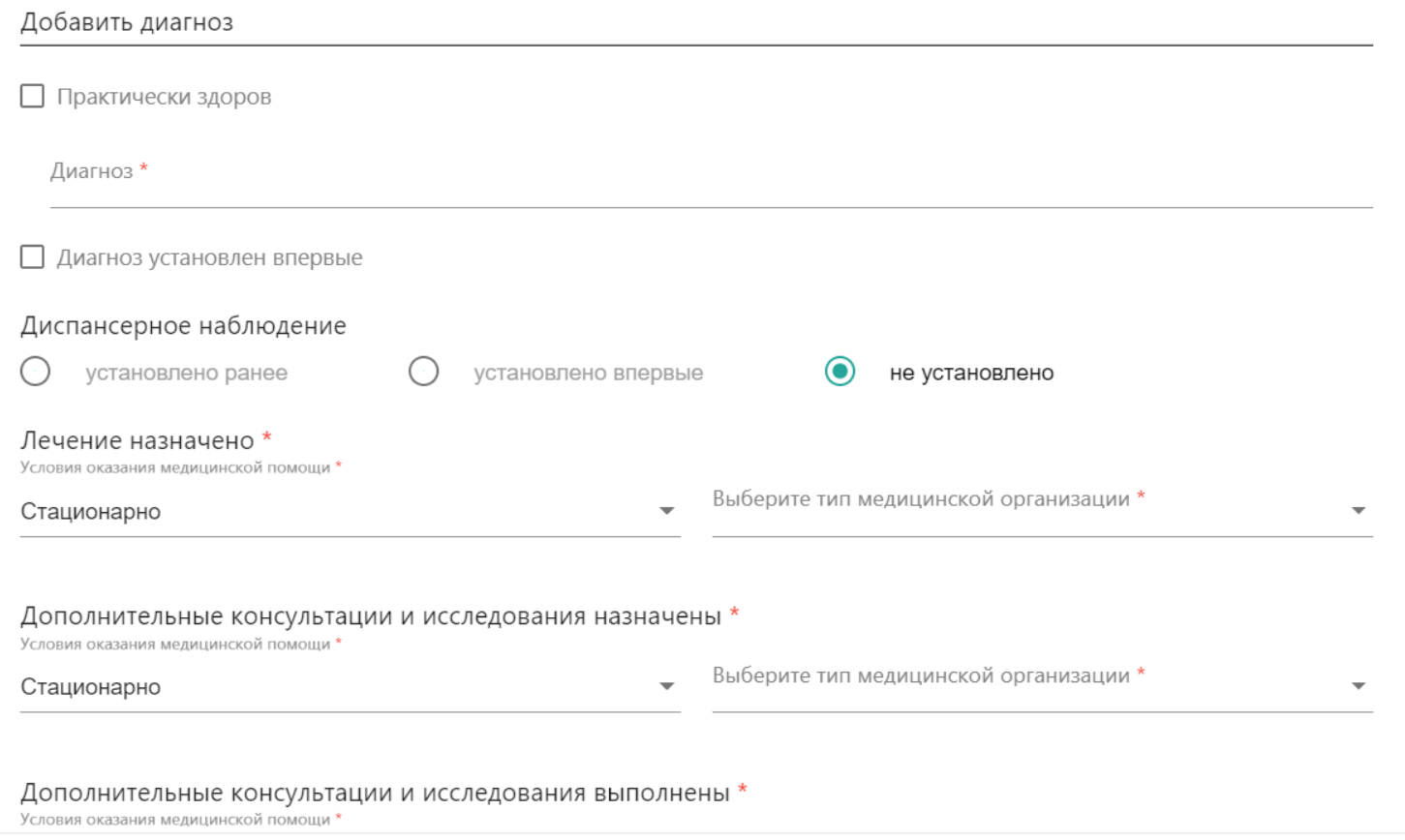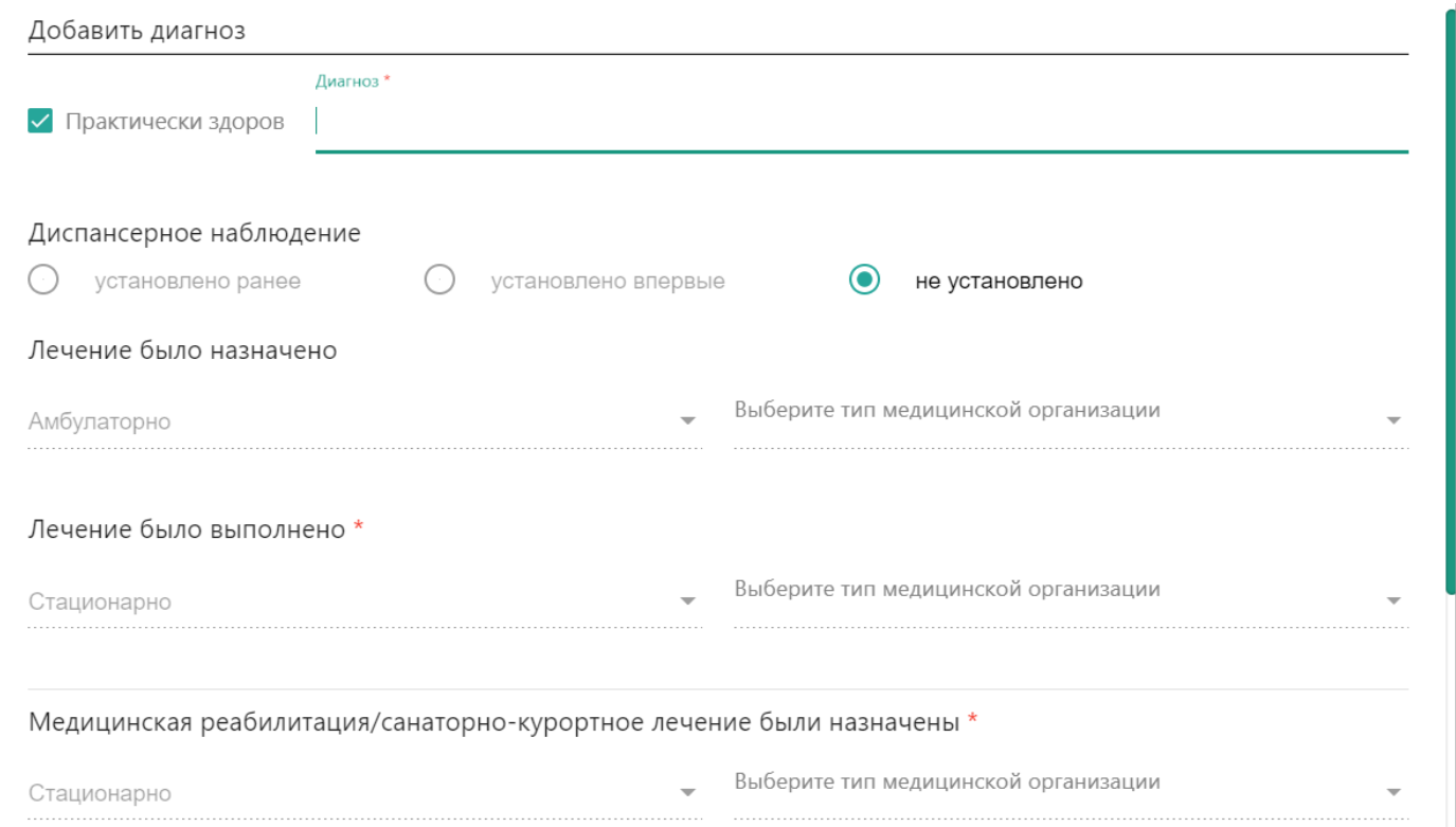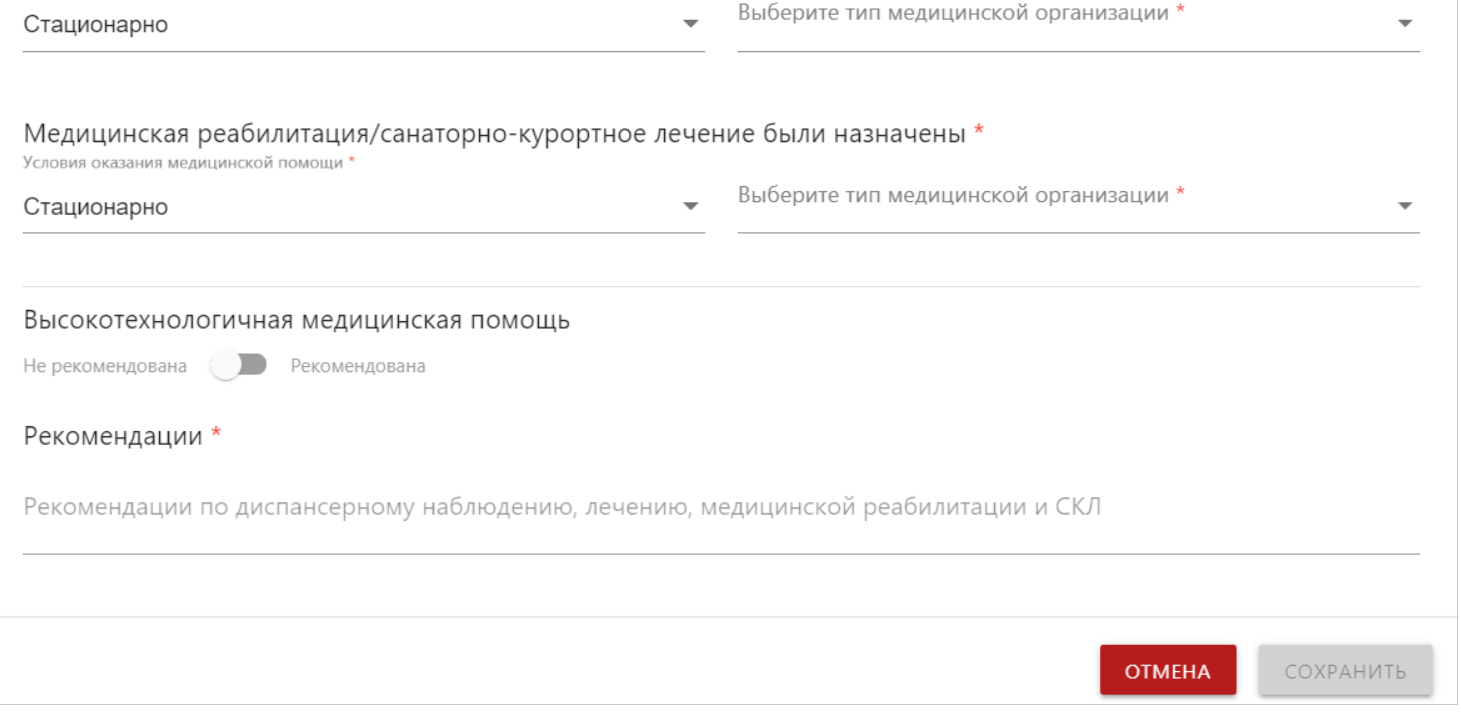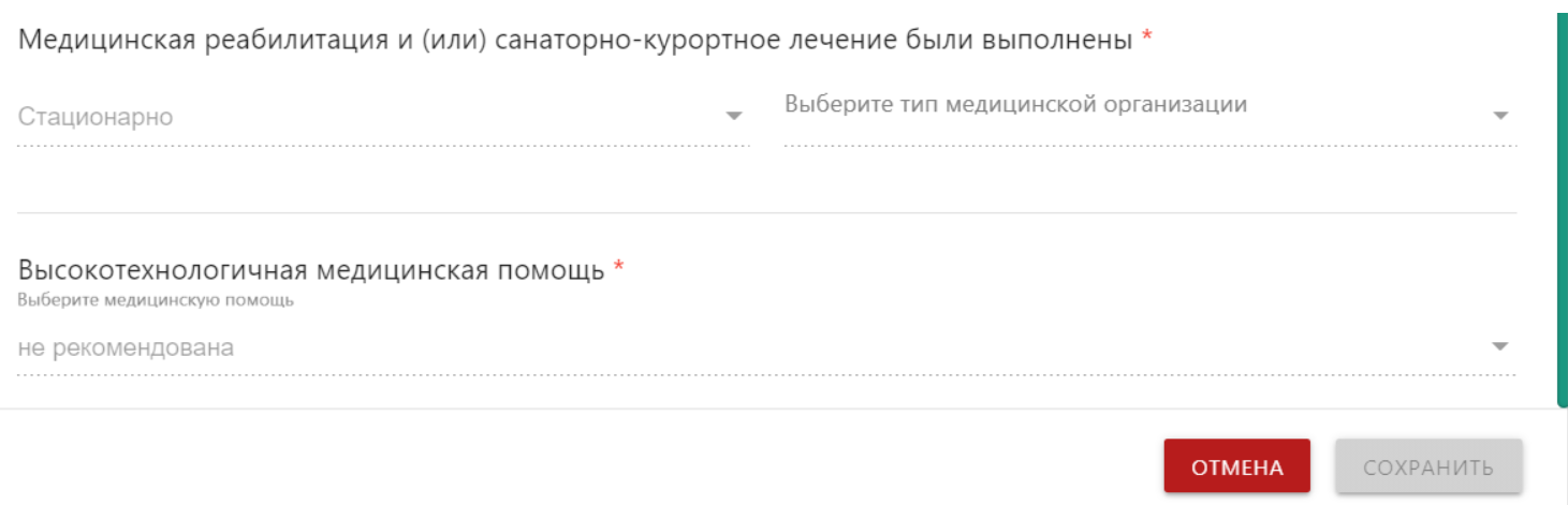 Для добавления заболевания необходимо нажать на кнопку «Добавить». Появится модальное окно, в котором предлагается указать Диагноз, было ли назначено/ выполнено лечение, были ли назначены/ выполнены медицинская реабилитация/ СКЛ, рекомендации по ВМП.