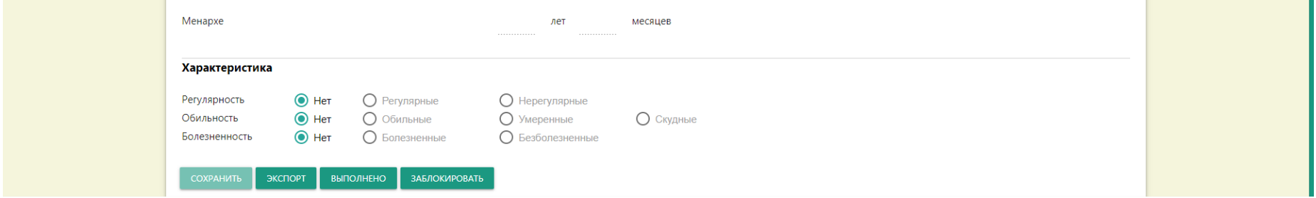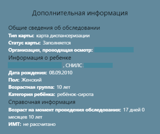 Для детей в возрасте 5-17 лет указываются вес и рост, нарушения в развитии, оценка психического развития и оценка полового развития (для детей старше 10 лет). Для девочек также показаны характеристики менструальной функции.