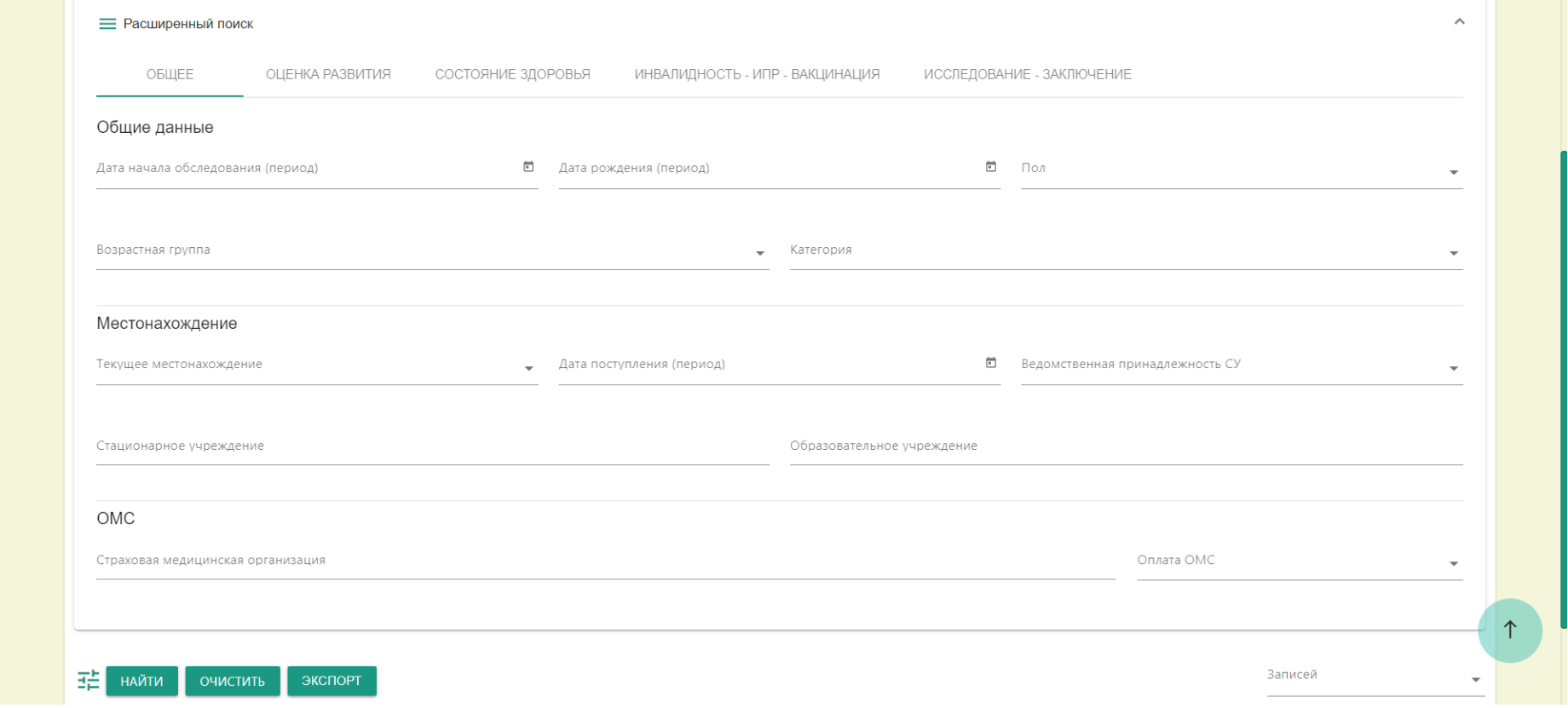 Подраздел «Карта ребенка» доступен из меню «Обследование/ Карта ребенка», «Обследование/ Поиск ребенка». С помощью нажатия на кнопку «Экспорт» можно выгрузить полученный список карт в файл формата MSExcel.