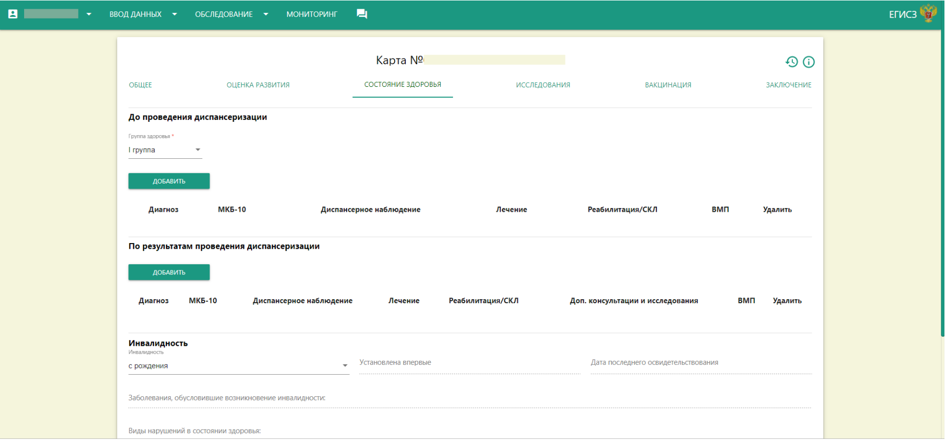 Вкладка «Состояние здоровья». Заполнение учетной карты № 030-Д/с/у-13