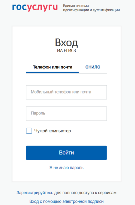 Для входа в Систему необходимо нажать на кнопку «Войти», после чего произойдёт переход на страницу авторизации ЕСИА (ИА).