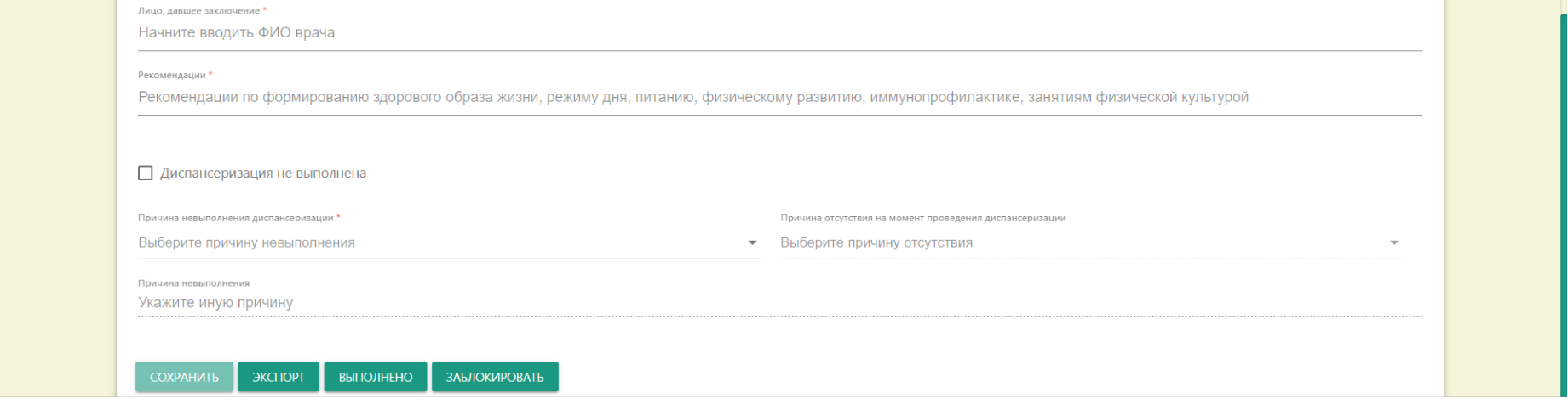 - если выбрана причина «другое», то в поле «Причина невыполнения» необходимо ввести текст, уточняющий причину невыполнения диспансеризации.