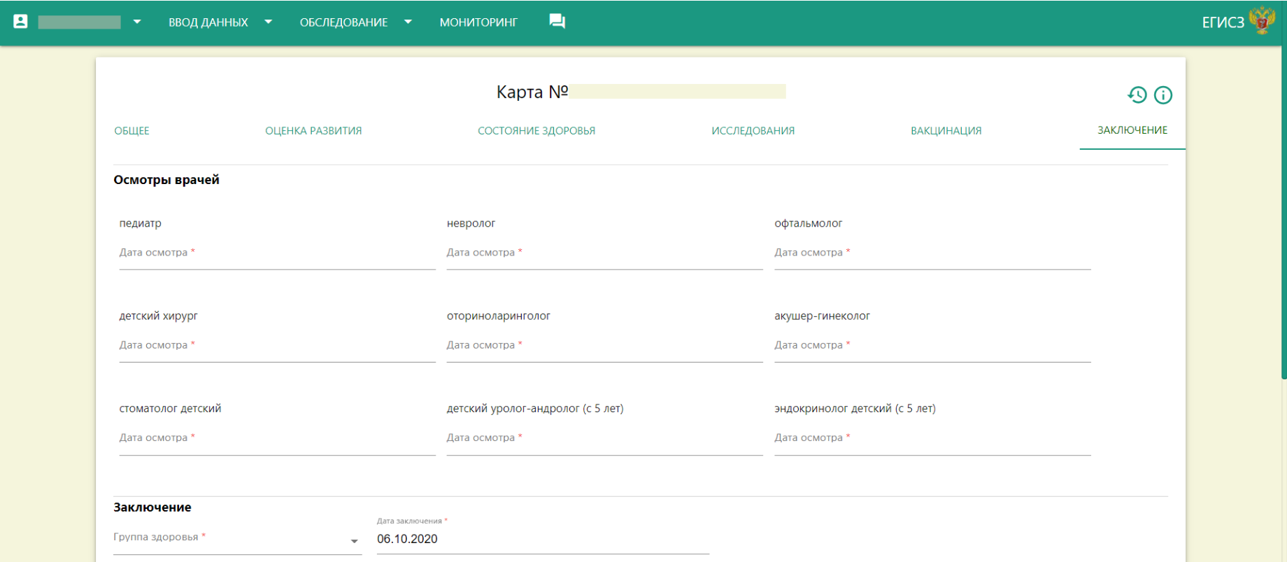 Вкладка «Заключение». Заполнение учетной карты № 030-Д/с/у-13