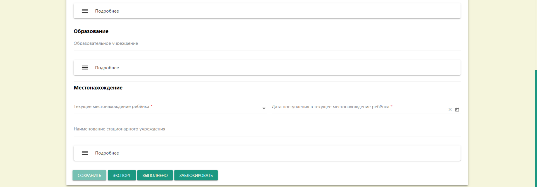 - на вкладке «Общее» нет полей о текущем местонахождении ребенка и о наименовании стационарного учреждения,