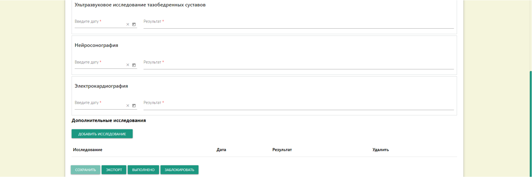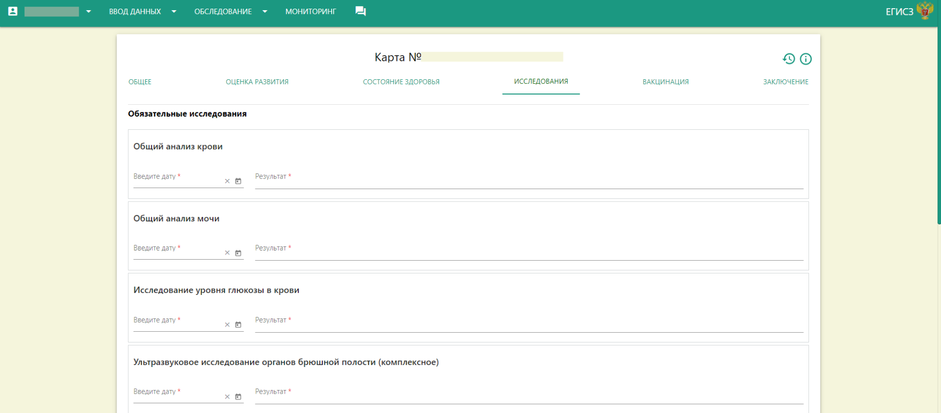 На вкладке «Исследования» указываются даты проведения лабораторных и всех прочих исследований, проведенных в ходе диспансеризации. Форма ввода является динамической и зависит от возраста и пола ребенка.