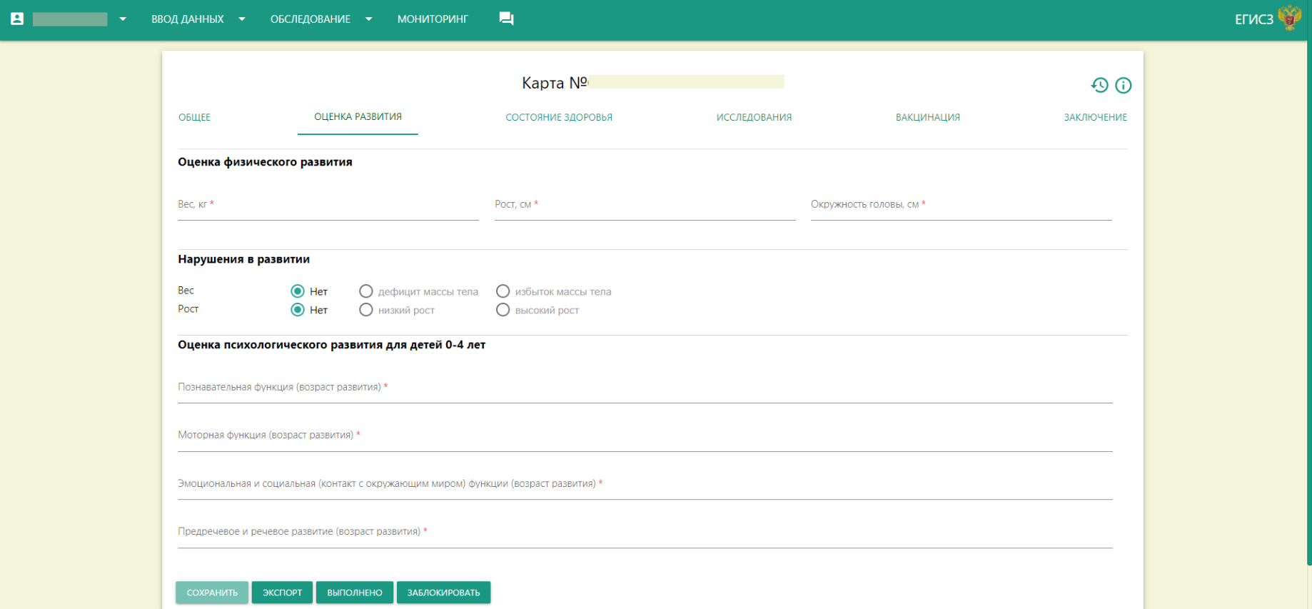 Рисунок 15 – Карта диспансеризации, вкладка «Оценка развития» для детей 0-4 лет
