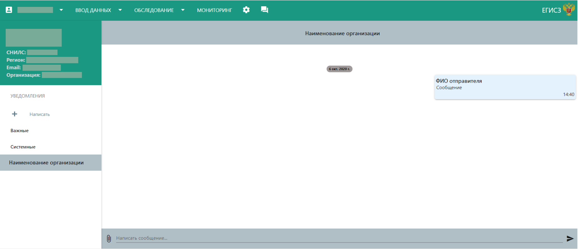 Чтобы создать новое уведомление, необходимо нажать кнопку «Написать», в поле «Кому» ввести название организации, в которую будет направлено уведомление, написать текст, прикрепить документ, нажав на кнопку