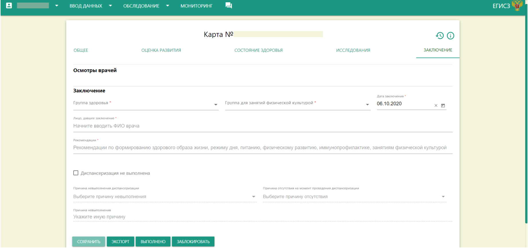 - на вкладке «Заключение» также, как и на вкладке «Состояние здоровья», указывается медицинская группа для занятий физкультурой по итогам проведенного профилактического осмотра.