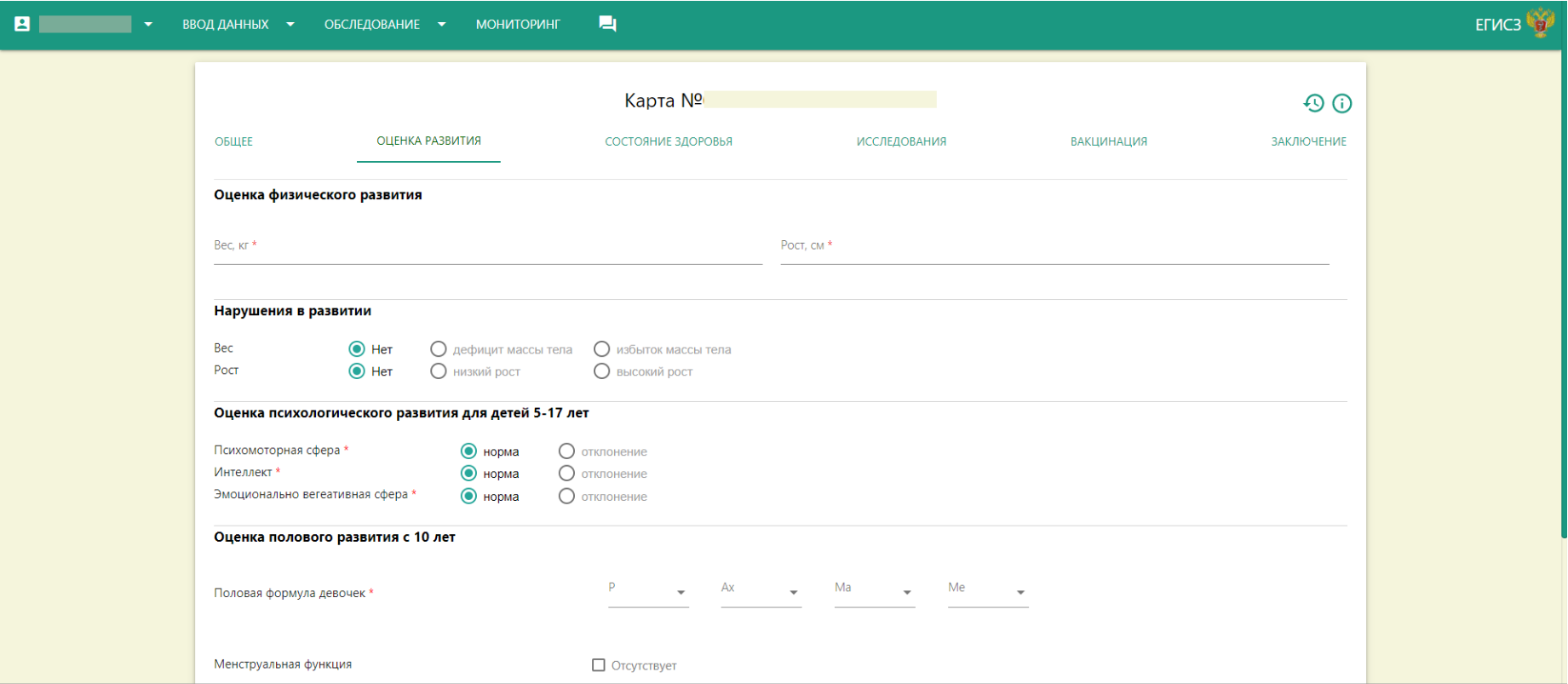 Рисунок 16 – Карта диспансеризации, вкладка «Оценка развития» для детей 5-17 лет (при выполнении условий, что ребенок женского пола в возрасте старше 10 лет)